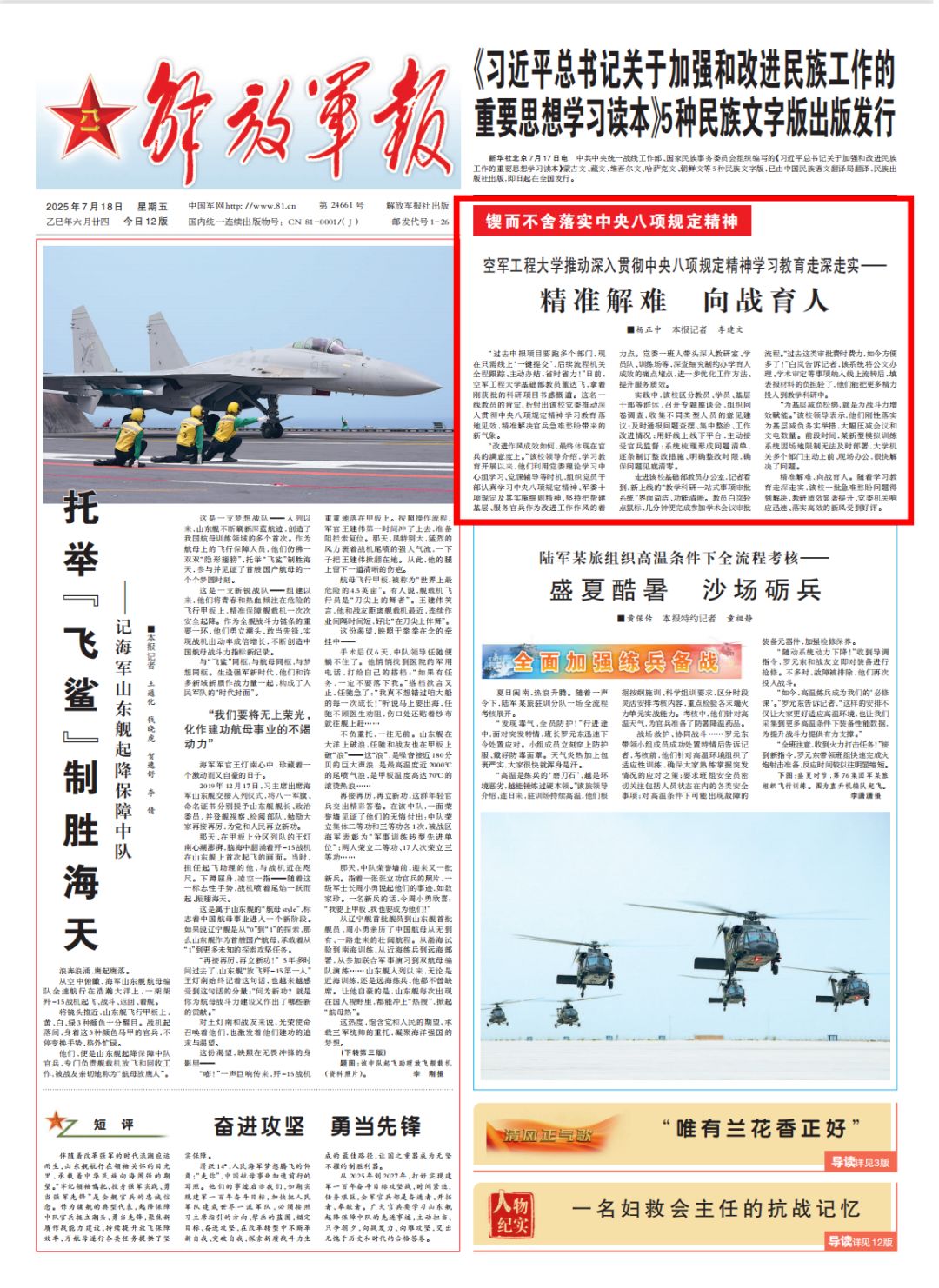 7月18日,《解放军报》头版以《精准解难 向战育人》为题,报道大学深入贯彻中央八项规定精神学习教育相关做法。《解放军报》公众号、中国军网等媒体同步转发。